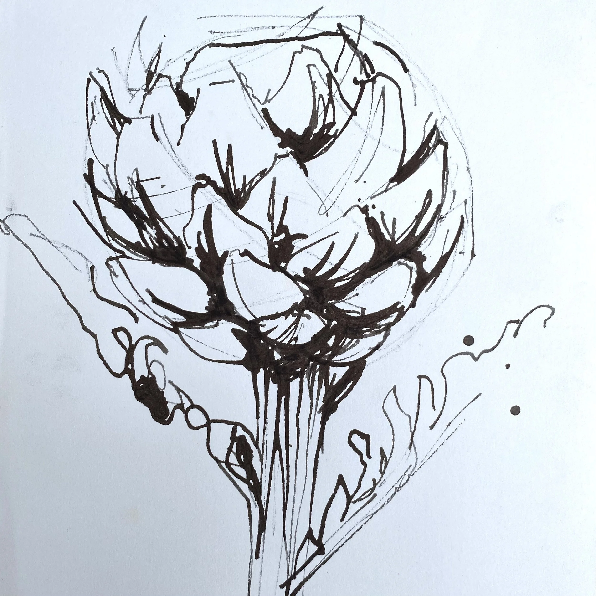 10 minute sketch with ink in a brush. The underlying criss-crossing diagonal structure on these spherical heads was fascinating - you can just see that i’ve sketched that in first before adding the ‘petals’.