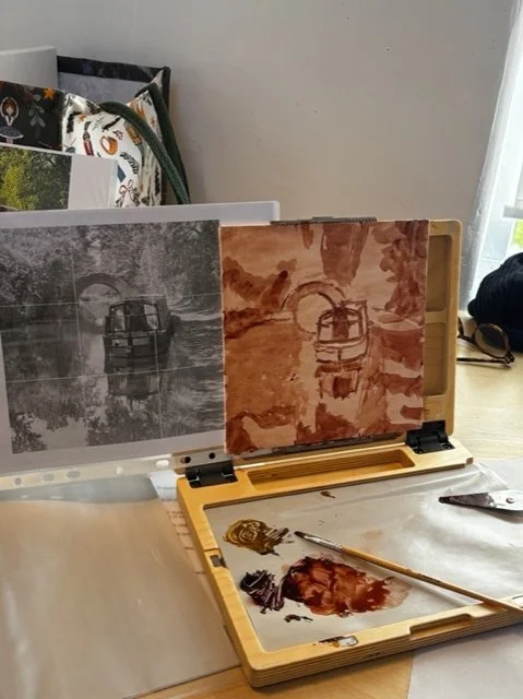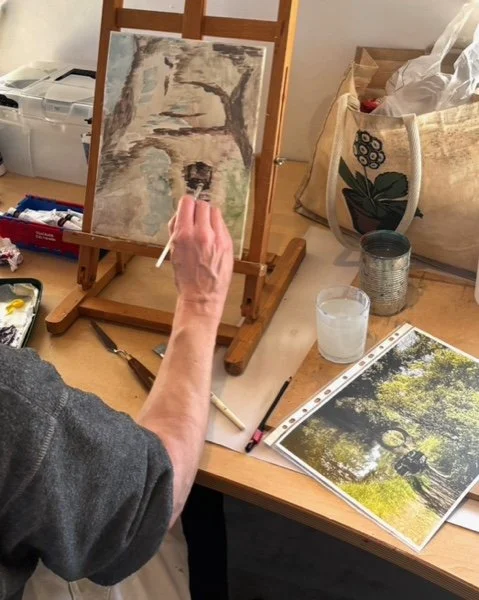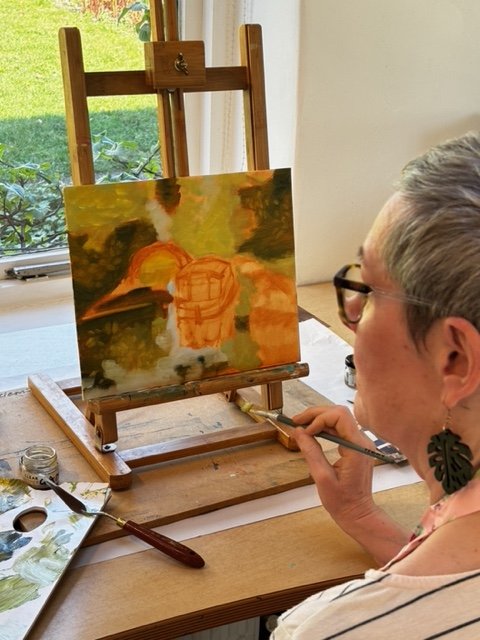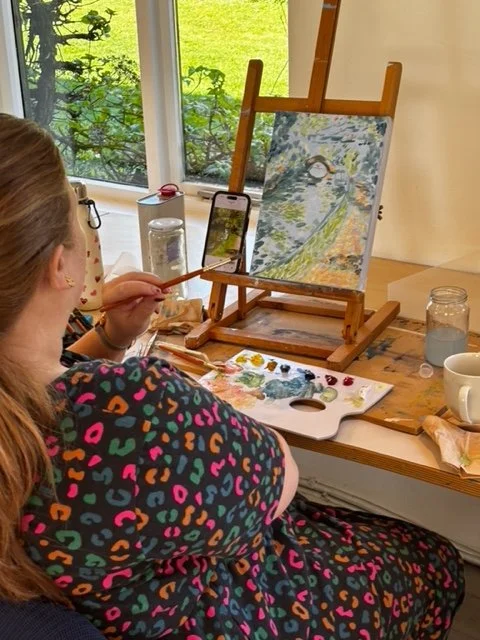 Starting with a chat, slides to discuss the work of ‘The Impressionists’ and an approach to painting in their style…we began with an underpainting to establish tones. The emphasis was on creating a visual impression of a scene rather than a precise, detailed representation of it. Using short, "broken" brush strokes of colour that were not blended smoothly or shaded. These small marks were to take precedence over lines and contours, to achieve an effect of intense colour vibration.